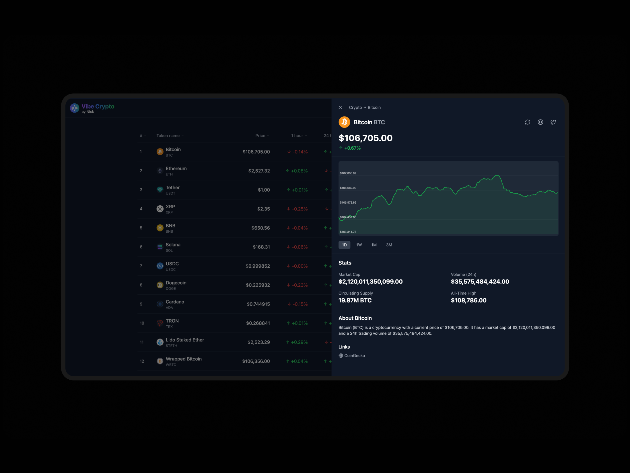 Real-time cryptocurrency tracking dashboard with market data visualization using the live CoinGecko API.