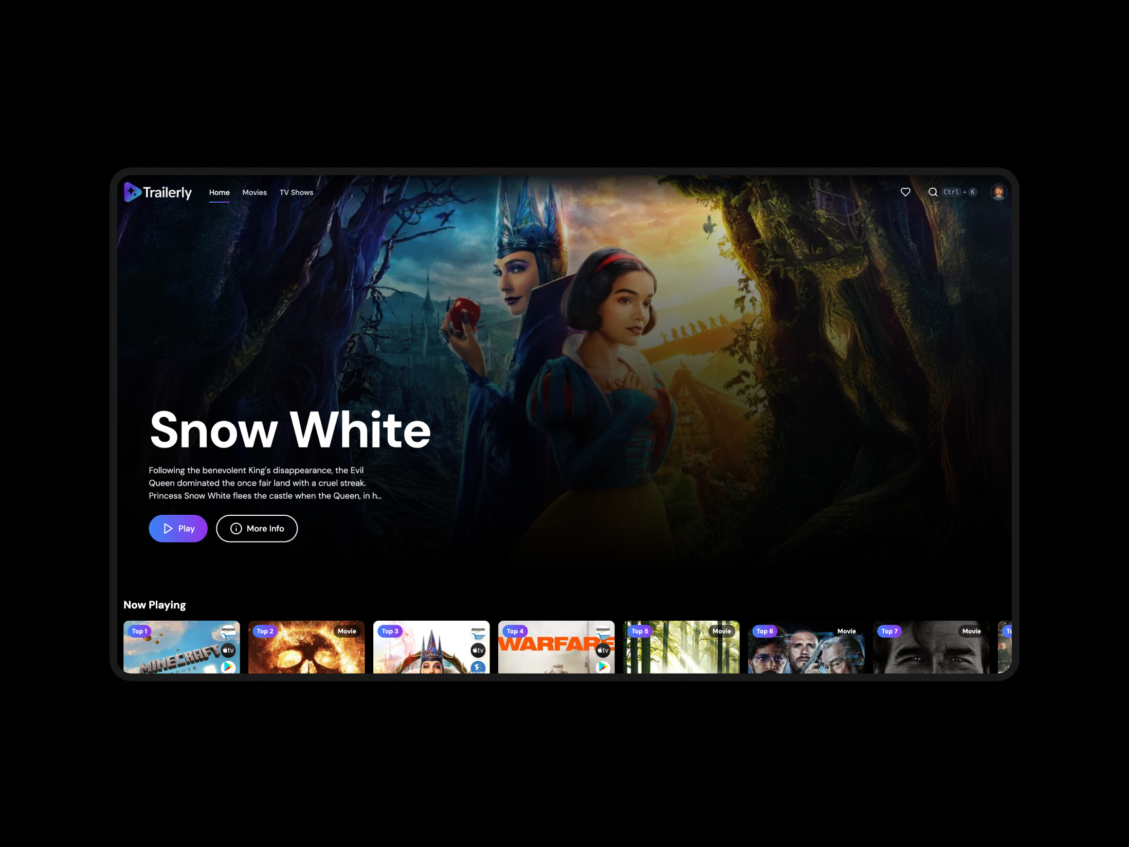 A streaming service Ul with dynamic content cards and video playback, pulling data from the Open Movie Database API.